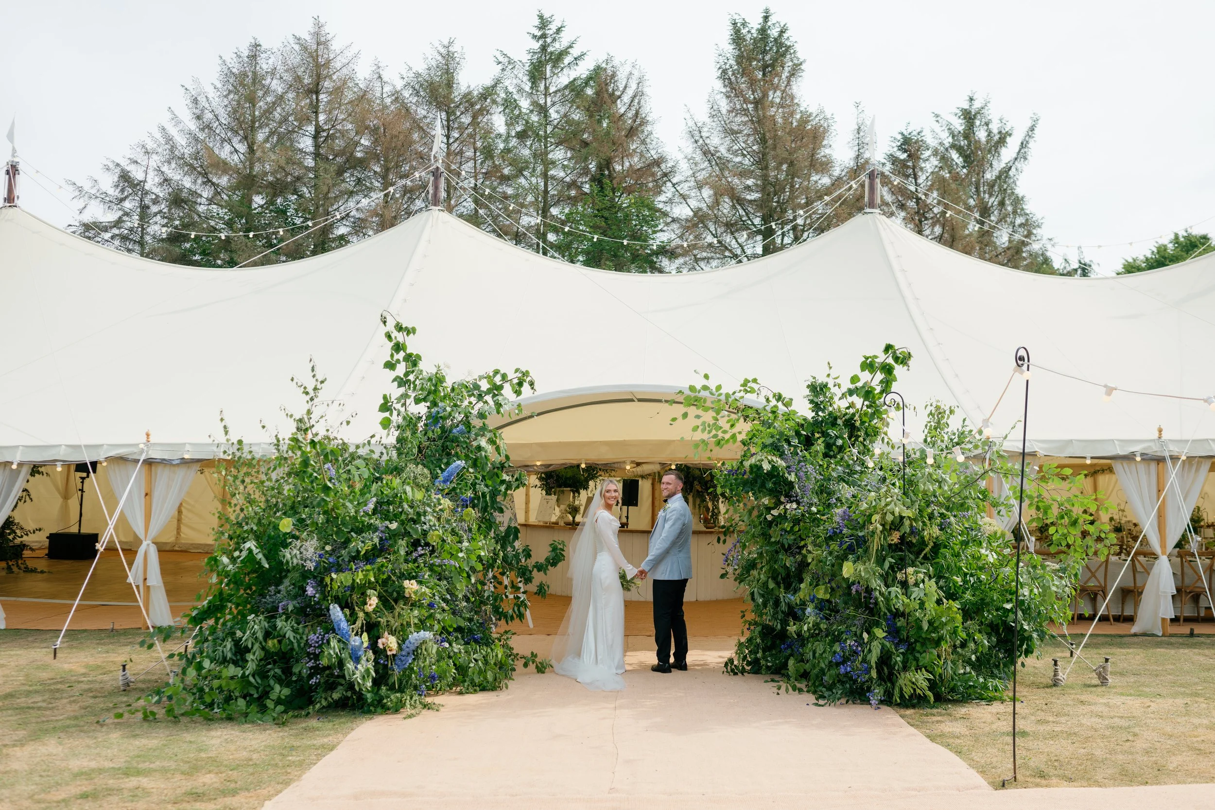 For this wedding, the floral installations were designed to be truly unforgettable, guiding guests on a journey from the estate grounds into the heart of the marquee. As guests made their way towards the reception, they were greeted by a huge, immersive floral arch, a breathtaking design that framed the entrance and set the tone for what was to come. Lush, abundant, and alive with seasonal flowers, it felt both awe-inspiring and welcoming. The perfect transition between the beauty of the gardens and the celebrations ahead.