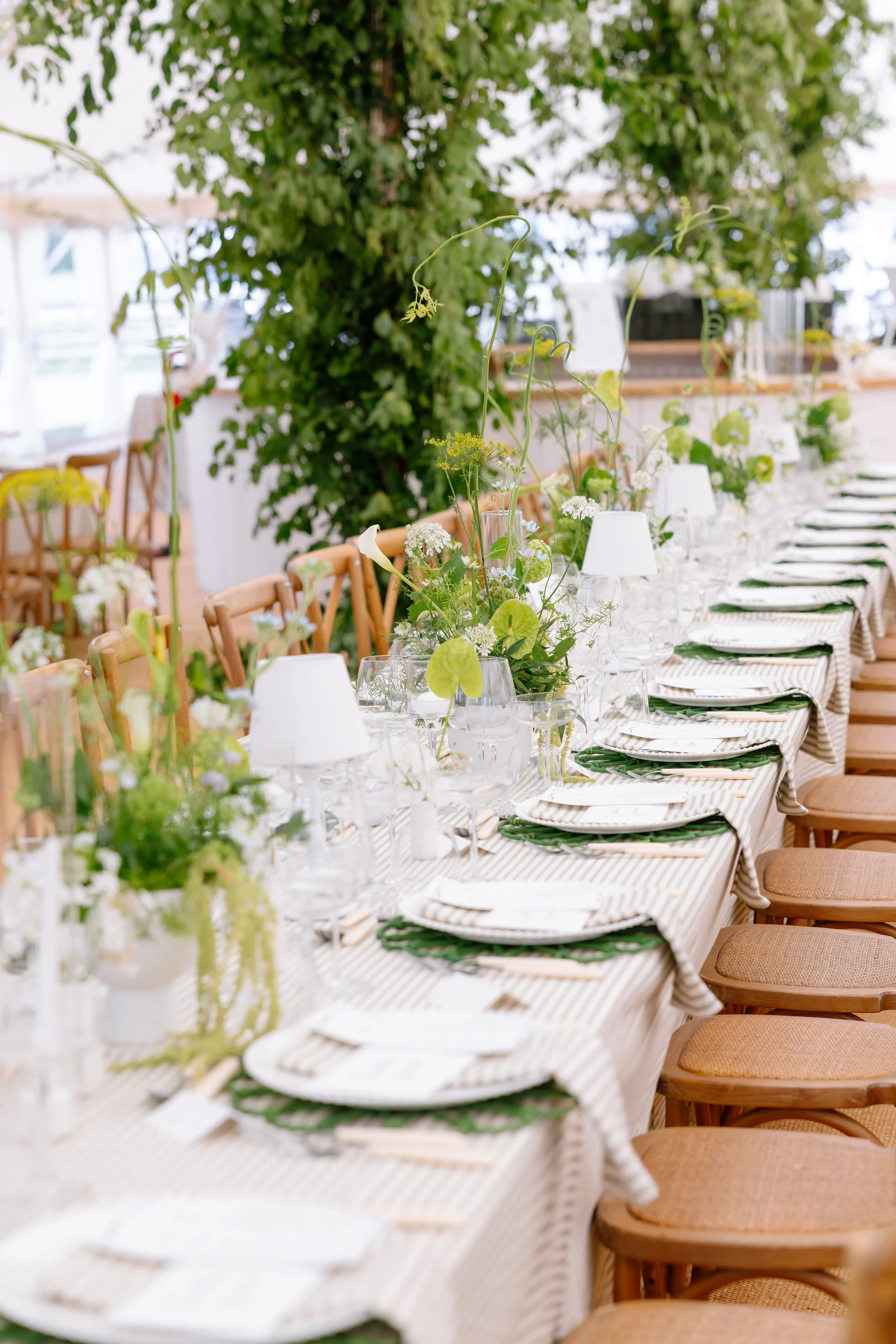 Inside the Wills marquee, we turned our attention to the structure itself. Rather than disguising the internal poles, we embraced them, transforming them with towering greenery that stretched right up to the ceiling. This created dramatic scale while keeping the look natural and informal, blurring the boundaries between the marquee and the surrounding estate. The effect was one of immersion: a space that felt less like a constructed venue and more like an extension of the gardens themselves, filled with movement, texture, and life.